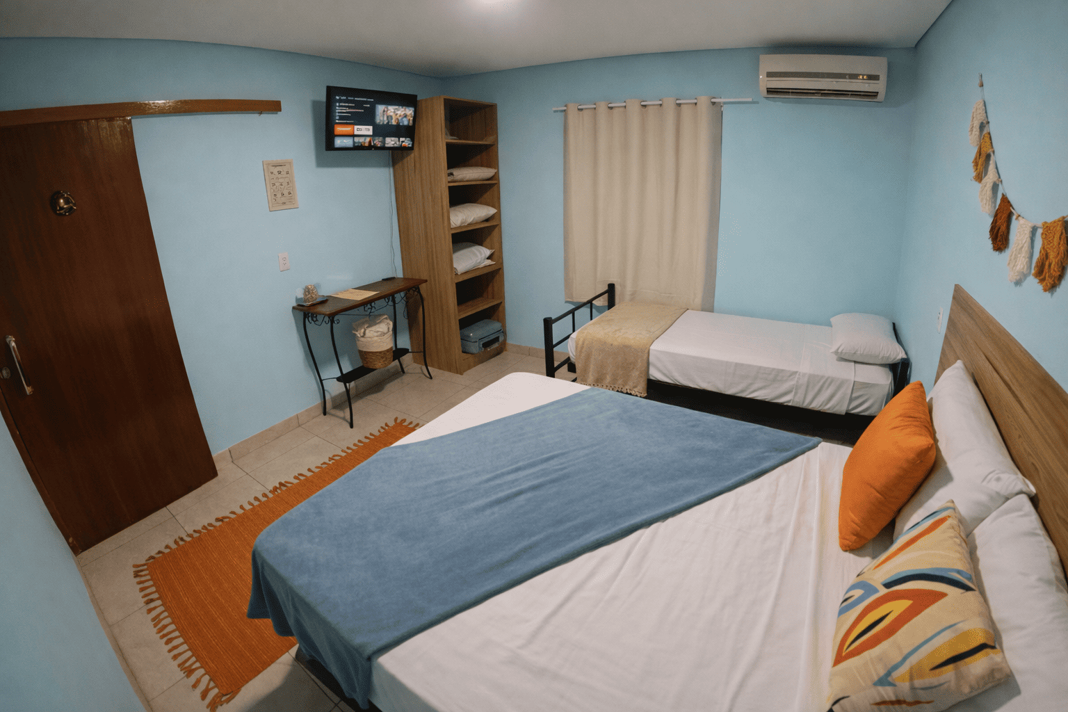A Suíte Ara é ideal para famílias ou pequenos grupos, acomodando até três pessoas. Conta com banheiro privativo com secador de cabelo, armário e TV com Netflix e Prime Video. Inclui roupa de cama, cobertas, toalhas de banho e sabonete líquido.